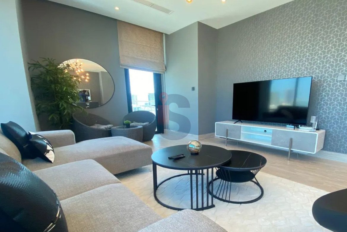 This modern, fully furnished apartment in Seef District boasts stunning city and sea views through large windows. The open layout features a bright living room, granite countertops, stainless steel appliances, and custom cabinets, perfect for entertaining.